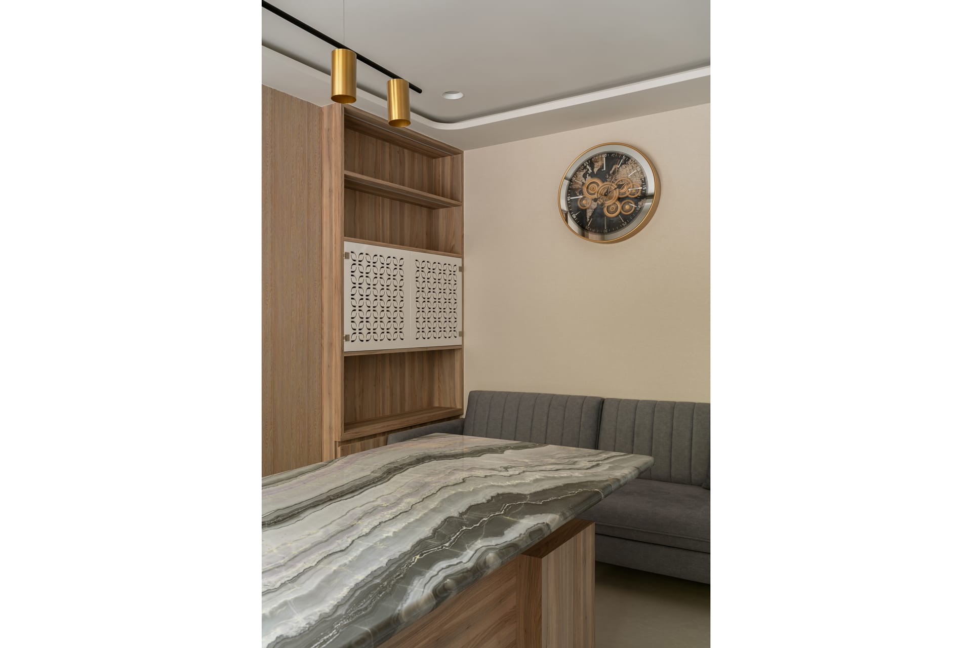 Architectural elements such as textured wall paneling, patterned glass blocks, and bespoke ceiling designs add depth and character to the space. Carefully planned lighting—combining recessed, linear, and decorative fixtures—ensures balanced illumination while accentuating key design features.