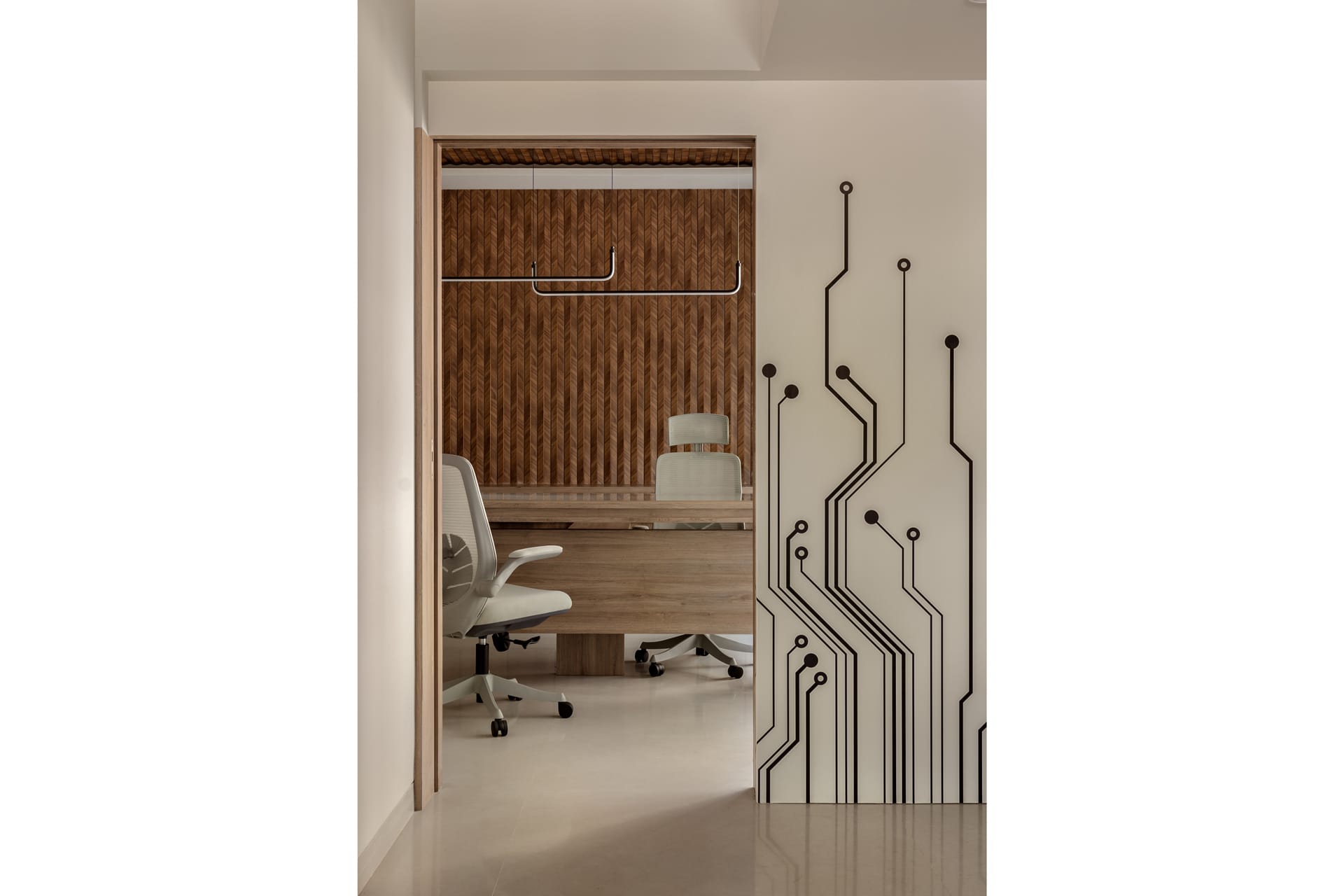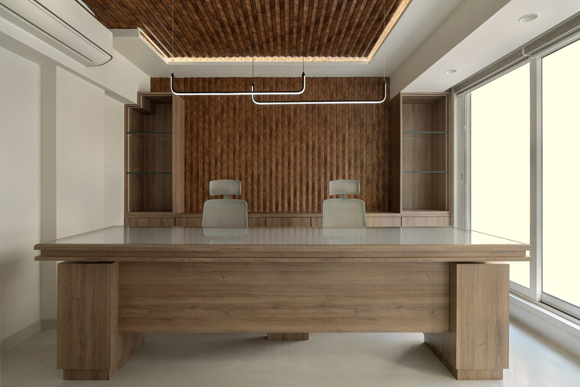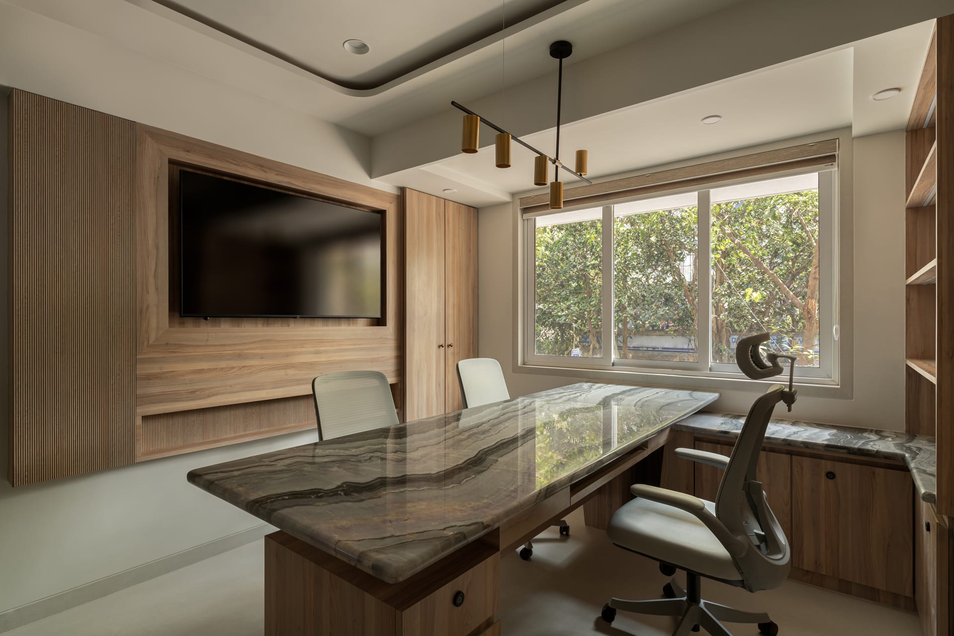 The interiors are defined by a warm palette of natural wood finishes paired with elegant stone surfaces, lending the space a sense of understated luxury. Custom-designed furniture, including sculpted worktables and ergonomic seating, enhances both comfort and usability, while maintaining a cohesive visual language throughout the office.
