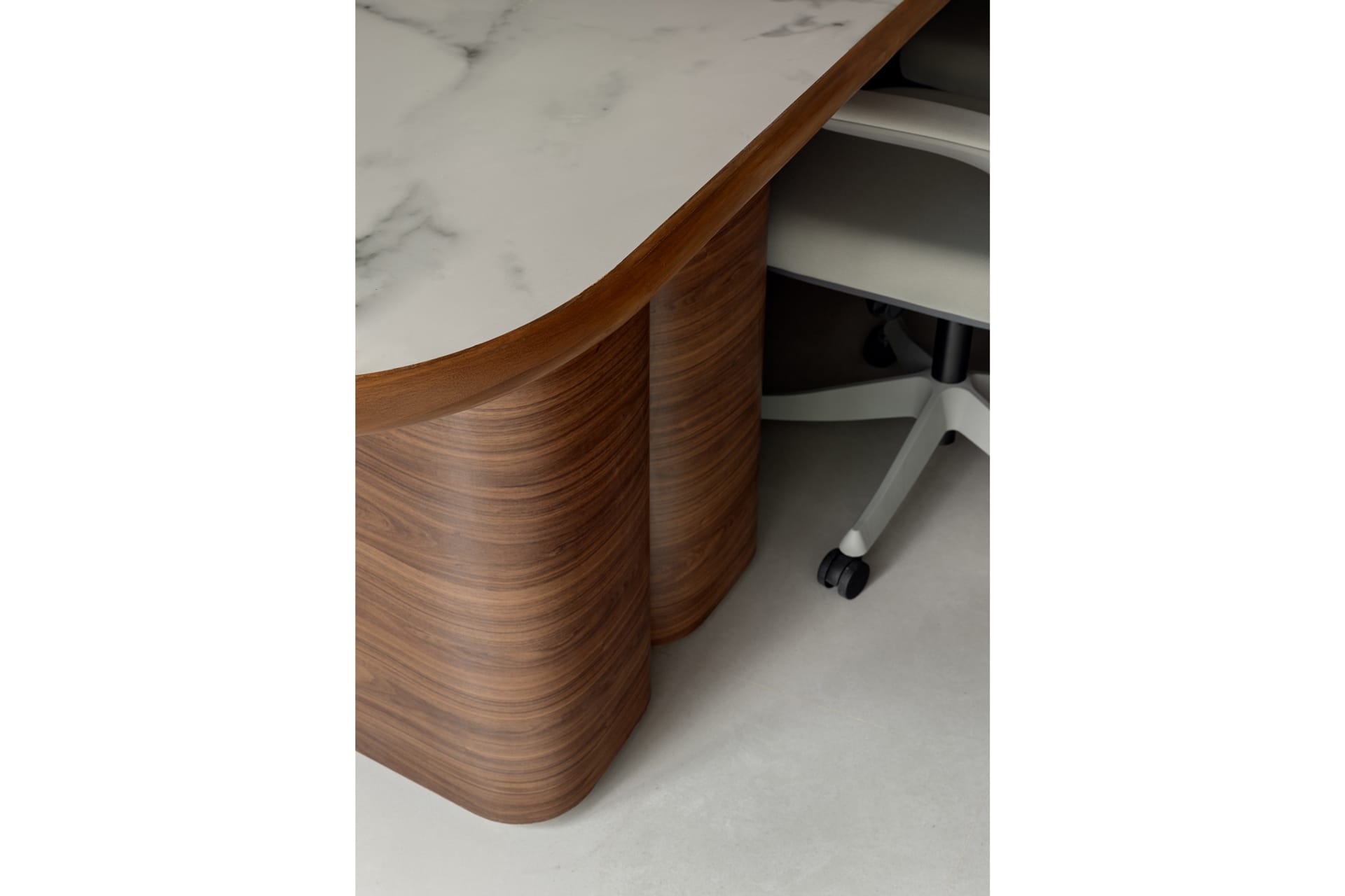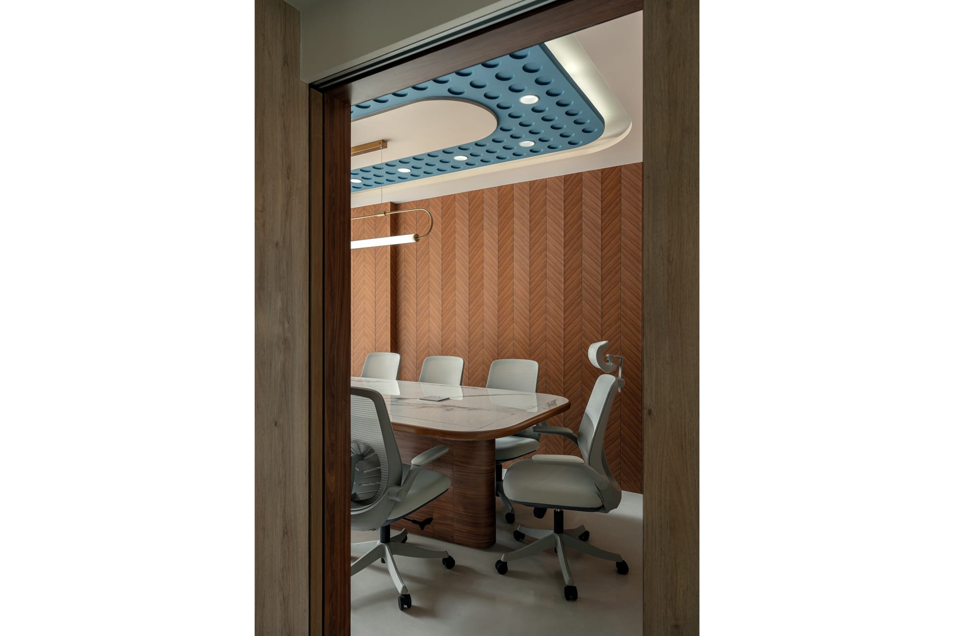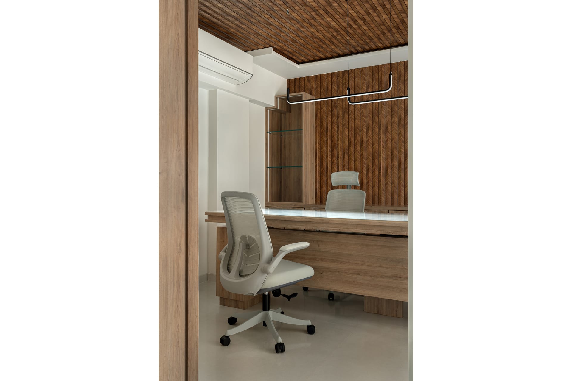 The interiors are defined by a warm palette of natural wood finishes paired with elegant stone surfaces, lending the space a sense of understated luxury. Custom-designed furniture, including sculpted worktables and ergonomic seating, enhances both comfort and usability, while maintaining a cohesive visual language throughout the office.