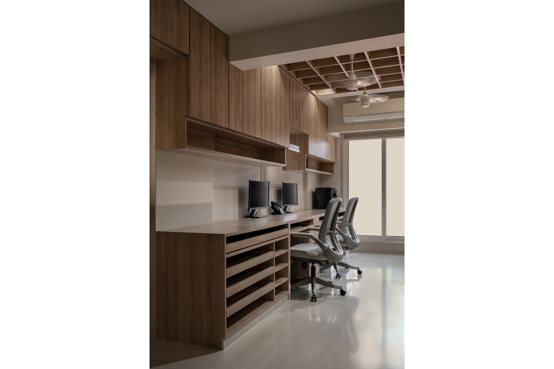 Large windows allow ample natural light to flow in, fostering a bright and welcoming atmosphere that supports productivity. Storage solutions and workstations are seamlessly integrated, keeping the space organized without compromising on aesthetics.