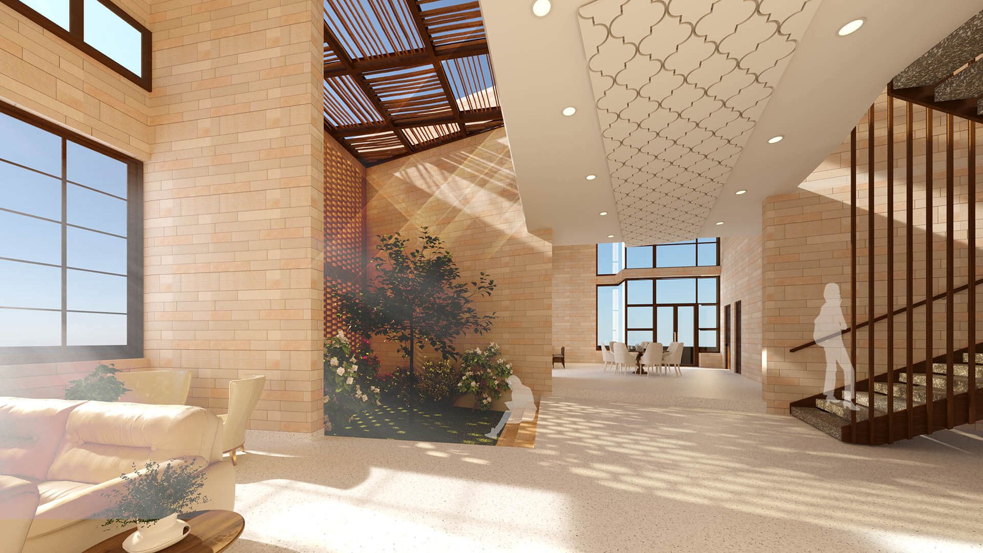This gorgeous homely abode has multiple influences of famous Rajasthani palaces. Intricate jalis and screens on the roofs and on the exteriors to conceal ducts and plumbing, create an interesting play of light and shadows over the entire exterior and interior of the home. Rooted in Rajasthani architecture, the house provides a courtyard, a central space within that connects the kitchen and double height living areas. Airy pergolas on the terrace with jali walls and a small vegetable garden in the landscape, combines a touch of royalty to the self-sustaining house.